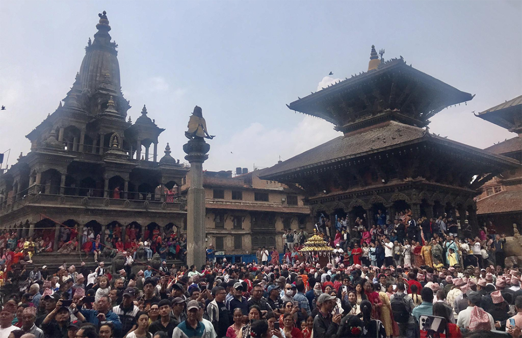 Manamaya was taken to take a round of her residence and neighborhood in a temple designed chariot carried by a number of people accompanied by traditional music and dances. This was likea full-fledged Jatra of a goddess. Honouring her, a function was also organized at Patan Durbar Square.
